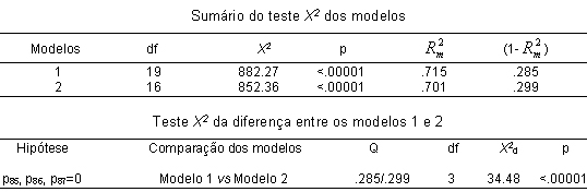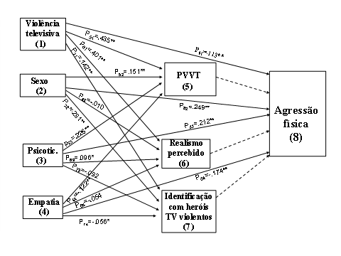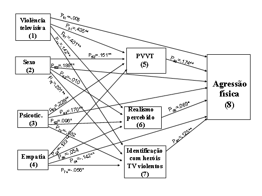 Da análise do Quadro 2 há a destacar que, quando comparamos as respostas obtidas na primeira questão, relativa à companhia dos pais, com a questão colocada relativamente à companhia destes, especificamente, durante a observação dos programas preferidos dos filhos, as percentagens são bastante diferentes. De facto, quando se trata dos programas preferidos dos filhos, a percentagem de respostas aumenta na opção Algumas vezes (66%) e diminui na opção Muitas vezes (16.5). A análise do Quadro 2 permite, ainda, concluir que uma grande parte dos indivíduos afirma que costuma conversar com os pais sobre a televisão, já que as percentagens mais elevadas se encontram nas opções de resposta Algumas vezes e Muitas vezes. São também elevadas as percentagens de indivíduos que afirmam ser ajudados pelos pais na compreensão da TV. No que se refere ao controlo exercido pelos pais, este surge como mais notório quando se trata do tempo dedicado à televisão (53,6% respondem Muitas vezes), embora haja, ainda, uma percentagem de 38,1 que responde Nunca ou Algumas vezes. Já no que diz respeito ao controlo pelos pais dos programas televisivos observados, este é menor (31,3% afirmam que os pais nunca controlam os programas que eles vêem). Com o objectivo de avaliar se o prazer em ver violência na televisão, o realismo percebido na violência televisiva e a identificação com heróis televisivos violentos desempenham um papel mediador na relação entre exposição à violência televisiva e agressão física recorremos à Path Analysis6. A perspectiva subjacente às análises efectuadas é a de que a influência da violência televisiva sobre a agressão dos espectadores poderá depender da forma como estes percebem os conteúdos observados. Ou seja, estes três factores constituem os mecanismos psicológicos pelos quais a exposição à violência na televisão influencia a agressão posterior das crianças e dos adolescentes. Como variáveis exógenas, para além da exposição à violência televisiva, foram ainda consideradas a empatia, o psicoticismo e o sexo dos participantes, com o objectivo de controlar a variância na variável endógena (agressão física), que possa ser explicada pelas variáveis exógenas em questão. O modelo de mediação formulado integra, então, as variáveis exógenas exposição à violência televisiva, sexo, empatia e psicoticismo, as variáveis mediadoras prazer em ver violência na televisão (PVVT),realismo percebido na violência televisiva e identificação com heróis televisivos violentos (IHV) e a variável endógena agressão física. Como forma de testar o modelo de mediação formulado, decidimos recorrer à abordagem dos modelos de equações estruturais apresentada por Specht (1975) para testar a mediação, que consiste numa análise comparativa de um modelo completo7versus um modelo sobreidentificado8, para testar hipóteses em modelos path, que tentaremos desenvolver e explicitar à medida que analisarmos os nossos dados. O diagrama de caminhos, apresentado na Figura 1 (Modelo 1), corresponde ao modelo plenamente recursivo, onde as ligações entre as diferentes variáveis (independentes, mediadoras e dependente) estão representadas pelos coeficientes de determinação dos caminhos correspondentes. Na Figura 2 é apresentado o modelo sobreidentificado, em que os caminhos das variáveis mediadoras para a variável dependente foram anulados. Figura 1. Modelo 1.Por questões de parcimoniosidade de apresentação gráfica, não estão representadas as relações entre os termos de erro (e) e as variáveis consideradas. *p<.05; **p<.01. A técnica de teste de modelos de Specht (1975) tem como regra geral a de que a diferença entre dois modelos pode ser testada por um teste X2, da diferença entre um modelo completo (full model) e um modelo sobreidentificado e permite concluir se os caminhos rejeitados (no modelo sobreidentificado) são ou não são necessários para explicar a variância conjunta das variáveis mediadoras e da variável dependente final. Aplicando a mesma regra à nossa hipótese, o teste X2 da diferença entre um modelo plenamente recursivo, composto pelas variáveis exógenas, mediadoras e dependente (Modelo 1, Figura 1) e um modelo sobreidentificado, onde os coeficientes das variáveis mediadoras para a variável dependente são anulados (Modelo 2, Figura 2), indicará se estes coeficientes anulados são, ou não, necessários para explicar a variância conjunta das variáveis mediadoras e da variável dependente final, ou seja, se a rejeição dos caminhos do PVVT, da identificação com heróis violentos e do realismo percebido nos programas televisivos violentos para a variável dependente final resulta numa perda significativa de poder preditivo do modelo. Num primeiro momento, constatou-se que os Modelos 1 e 2 explicam uma percentagem significativa da variância conjunta da variável dependente e das variáveis mediadoras (71,5% e 70,1%, respectivamente), dado que o teste X2 dos modelos se revelou estatisticamente significativo (Modelo 1: X2=882.27, p<.00001; Modelo 2: X2=852.36, p<.00001). Para testarmos o papel mediador das três variáveis de percepção identificadas, consideraram-se os coeficientes p85, p86 e p87 nulos e calculou-se o teste X2 da diferença entre os dois modelos (modelo plenamente recursivo e modelo sobreidentificado). Sendo o teste da diferença entre o modelo plenamente recursivo (Modelo1) e o modelo sobreidentificado (Modelo 2) estatisticamente significativo (Quadros 3 e 4), isto significa que o modelo que integra todos os coeficientes de determinação dos caminhos difere, significativamente, do modelo em que os caminhos das variáveis mediadoras para a variável dependente são anulados, o que indica que as variáveis mediadoras são necessárias para explicar a variância na agressão física, resultando a anulação destes coeficientes numa perda significativa de poder preditiv