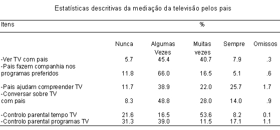 Em consonância com o tempo dedicado à televisão verifica-se ainda uma grande disponibilidade deste meio, visível no número médio de 2.79 televisores por casa (Moda=2) e ainda no facto de 42% dos participantes terem acesso à TV por cabo. A estes dados, acrescente-se que 44,4% das crianças e dos adolescentes da amostra possuem televisão no quarto. No que se refere ao contexto de exposição à televisão, pretendeu-se conhecer a frequência da mediação parental. No Quadro 2 apresentam-se as estatísticas descritivas relativas ao tipo de mediação (co-exposição, mediação restritiva e mediação avaliativa5) exercido pelos pais. Estatísticas descritivas da mediação da televisão pelos pais