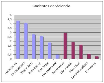 Cociente de violencia. Mediante el sistema de categorías presentado se elaboró un registro de frecuencias. Así, dispusimos del número de conductas correspondientes a cada categoría, por capítulo y por serie. Consignamos también la duración de cada episodio, por lo que pensamos que un buen índice comparativo podía establecerse mediante el cociente resultante entre la frecuencia hallada y el tiempo. De esta manera, dicho cociente nos mostraría el número de ocurrencias por minuto de una determinada categoría. Así podemos saber, por ejemplo, cuántas amenazas o intimidaciones por minuto se han producido en un capítulo de Las Supernenas. - Resultados A continuación, iremos mostrando los resultados obtenidos a partir del análisis realizado. En primer lugar nos centraremos en los datos más genéricos para ir, posteriormente, pasando a comentar las conclusiones a que hemos llegado tras observar qué ha ocurrido en cada una de las dimensiones. Es preciso mencionar que las valoraciones se realizan a partir de los cocientes obtenidos. Datos globales